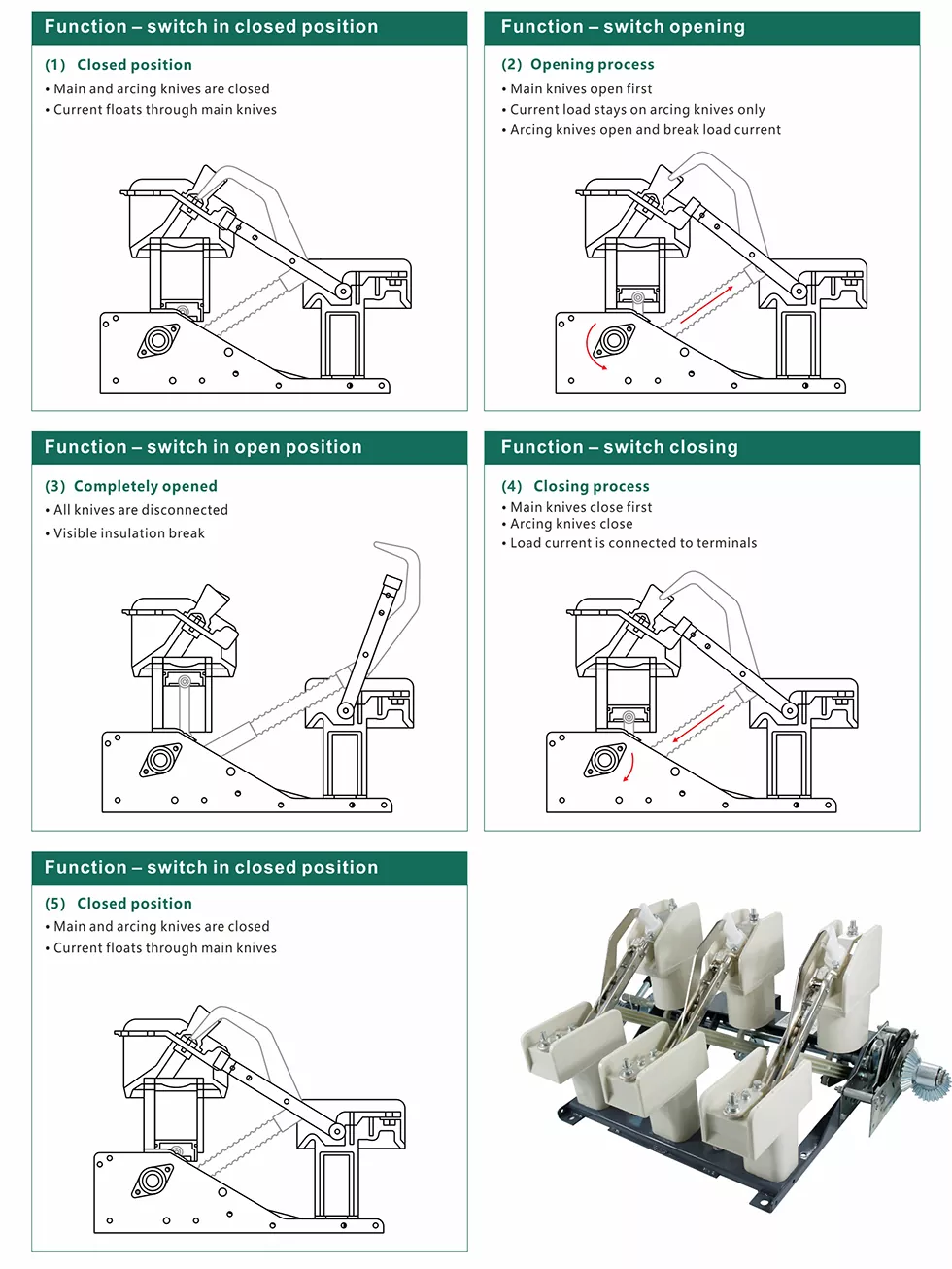 Внутренний нагрузочный переключатель FN18-24-KV FN18-24KV предназначен для подключения и отключения цепей в нормальных условиях тока, работая непрерывно в условиях неисправности, уменьшает ток до его уровня закрытия неисправности и работает в сочетании с предохранителями.
